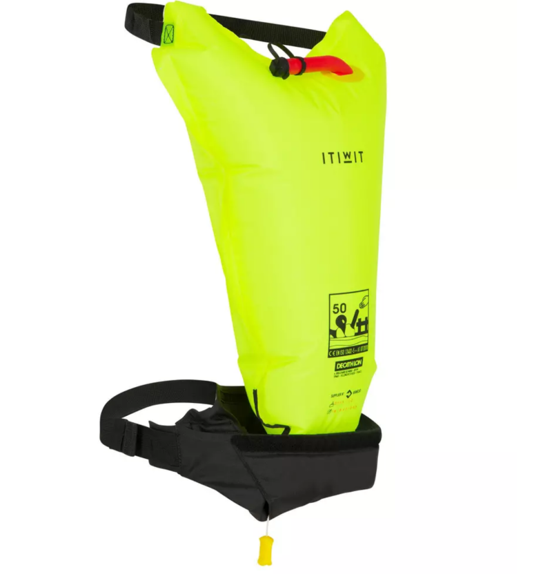 - Alle sluitingen en de ceintuur moeten bevestigd zijn; de kruisbanden zijn extra belangrijk, omdat die voorkomen dat je vest van je lichaam schiet zodra je het water raakt.